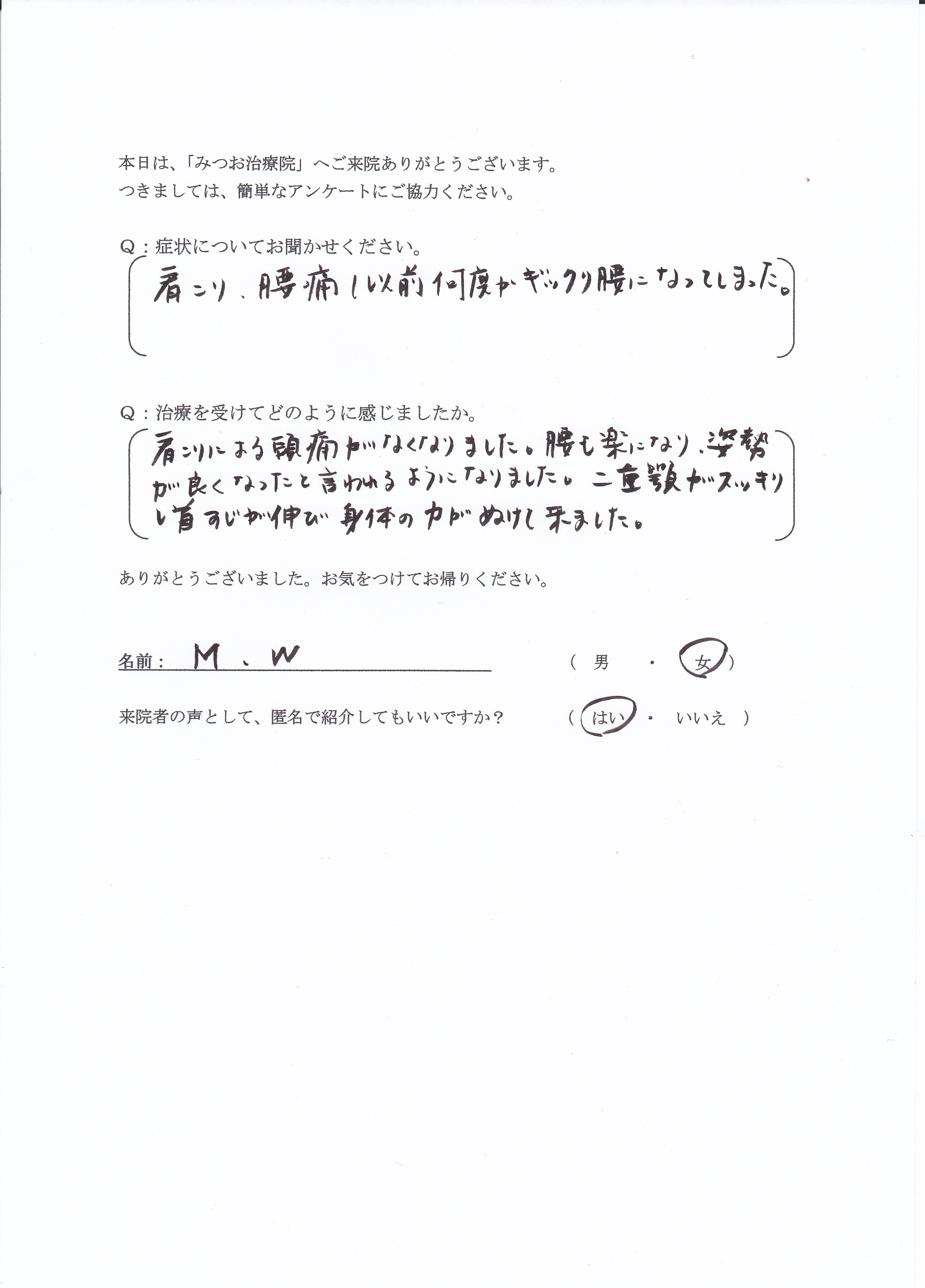 | 治療をうけて | 肩こりによる頭痛がなくなりました。腰も楽になり、姿勢が良くなったと言われるようになりました。 二重顎がスッキリし首が伸び身体の力がぬけて来ました。 |